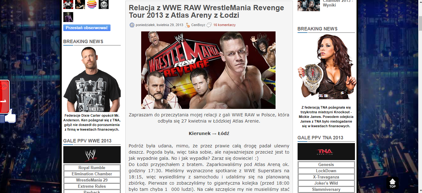 Moją przygodę z pisaniem na portalach o tematyce wrestlingu zacząłem w 2011 roku. Uwaga, miałem wtedy jeszcze 12 lat 🙂 W tamtym czasie bardzo popularne były blogi, szczególnie te budowane na serwisie blogger.com. Blog od którego ja zaczynałem nazywał się „Wszystko o RAW”, który – niech nazwa nie będzie myląca – wcale nie był tylko o RAW. Pod nickiem CenBoyz publikowałem przede wszystkim newsy.