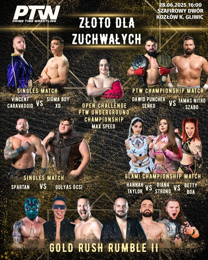 Już dziś kolejna gala organizacji Prime Time Wrestling podczas wydarzenia czeka nas wiele emocjonujących pojedynków. Zwieńczeniem wieczoru będzie drugi w historii PTW Gold Rush Rumbel. Lecz co jeszcze czeka publikę Kozłowie?